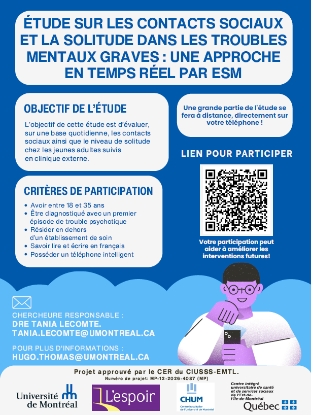 Des participant·es sont recherché·es pour une étude chapeautée par Dre Tania Lecomte: les contacts sociaux et la solitude dans les troubles mentaux graves: une approche en temps réel par ESM.